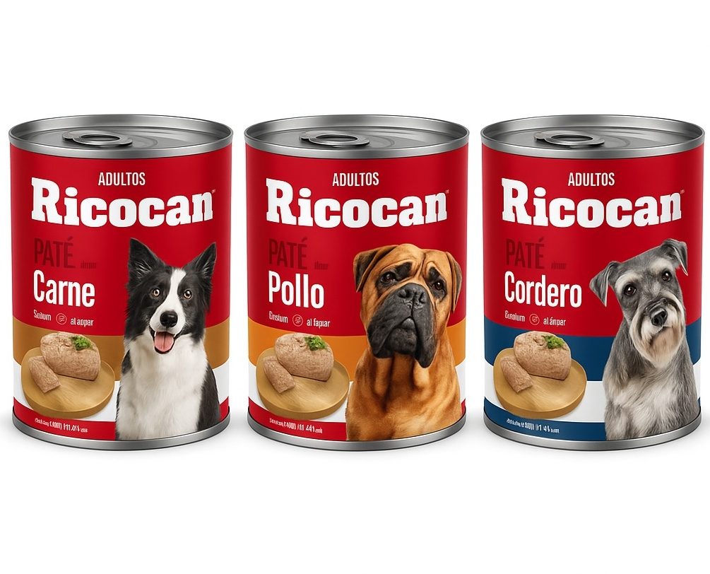 Ricocan Paté 330gr es un alimento húmedo completo y balanceado para perros adultos, elaborado con ingredientes seleccionados y cocido al vapor para conservar su sabor, textura y valor nutricional. Su fórmula aporta proteínas, vitaminas y minerales esenciales que favorecen la energía, vitalidad y bienestar general de las mascotas. Además, cumple con los estándares de calidad nutricional, contribuye a una buena hidratación gracias a su contenido de humedad y facilita la digestión por su textura suave y apetecible. Su aroma y sabor son irresistibles incluso para los perros más exigentes, convirtiéndose en una alternativa práctica y económica sin perder calidad. Está disponible en tres deliciosos sabores: carne, pollo y cordero.